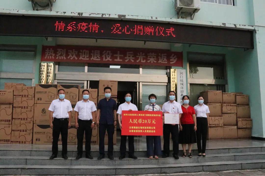 近日,云南省退役军人关爱基金会秘书长何文俊携云南雅赫生物科技有限公司,到河口县开展“情系疫情·爱心捐赠”活动,县政府副县长李华梅及县红十字会、县退役军人事务局相关领导出席捐赠仪式。