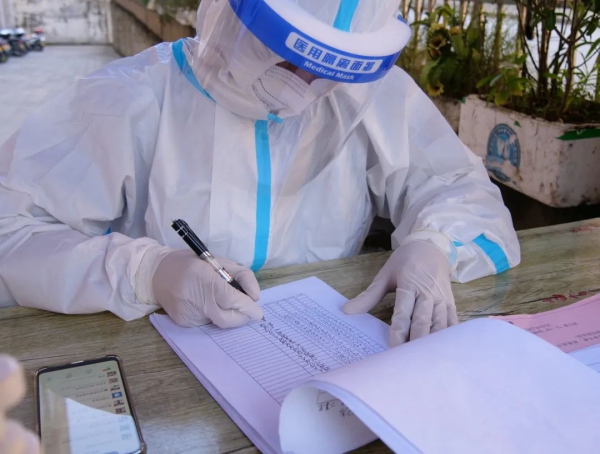 在守护居民安全的同时,消杀员也严格做好个人防护。同时,消毒后会及时填写楼栋消毒记录表,确保消毒工作落实到位。