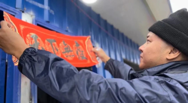 与桥头乡卡点上的执勤人员一起过年,给他们贴春联