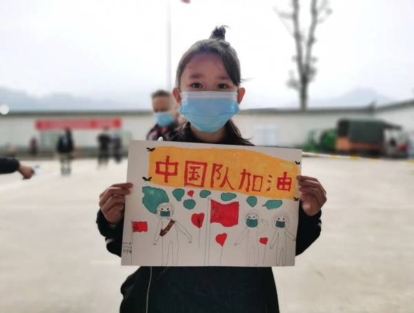 原来,这是来自河口县北山小学二年级(1)班的张鋆曦小朋友亲手画的一幅画。薄薄的纸面上是小朋友用笔画出的在鲜艳五星红旗下穿着防护服的小人儿,画面中还写着显眼的“中国队加油”,在纸背面晕开的水彩笔印记,仿佛让大家看到小朋友在画画时,一笔一笔认真涂抹的模样。薄薄的纸仿佛瞬间沉甸了起来,小朋友心中记得的都是奋战在一线与大家一起渡过难关的疫情防控工作者们!