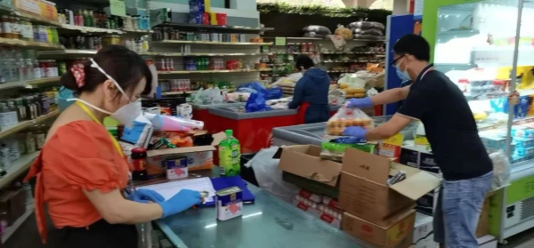 3月22日下午,记者来到北山兴隆超市门口看到,超市内工作人员正在有条不紊地按照居民订单挑拣商品,并快速对订单商品进行打包整理,由外围配送员配送到各小区执勤点。