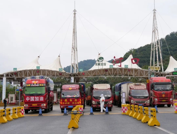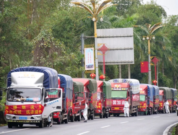 2月22日下午,11辆满载物资的货车依次通过蒙河高速公路河口收费站出口处,有序驶向城区物资储备场所,河口团县委立即组织志愿者进行货物搬运。“中国加油”“众志成城 抗击疫情”“向河口县疫情防控一线工作者致敬”等横幅悬挂在车体周围,“一方有难,八方支援”的援助精神感染着每一个人。