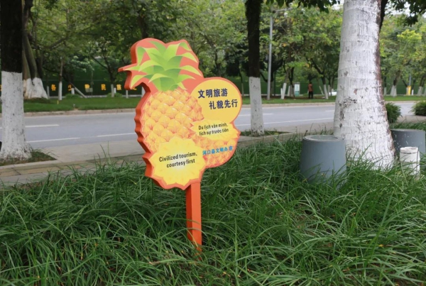 “人人爱护花草,空气环境好;垃圾不会走路,请送他们回家;文明旅游,礼貌先行……”在河口口岸花园、街心花园、森林公园、火车站、滨河路沿线等地,处处可见形状各异、与周边环境协调的三语温馨提示牌,它们用吸睛的造型、鲜艳的色彩吸引着大家的眼球,温馨提醒的同时,成为河口县一道靓丽的文明风景线。