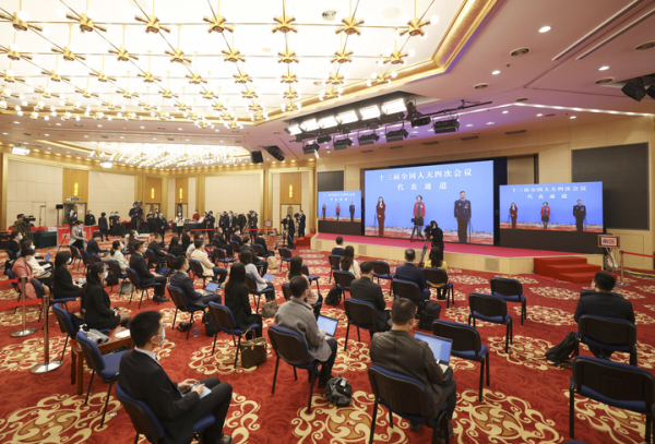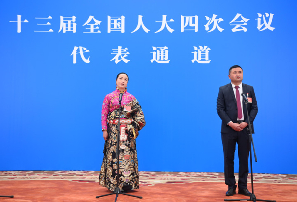 3月5日,第十三届全国人民代表大会第四次会议举行首场“代表通道”采访活动。这是全国人大代表苏伯民(左)、查艳通过网络视频方式接受采访。新华社记者 金良快 摄