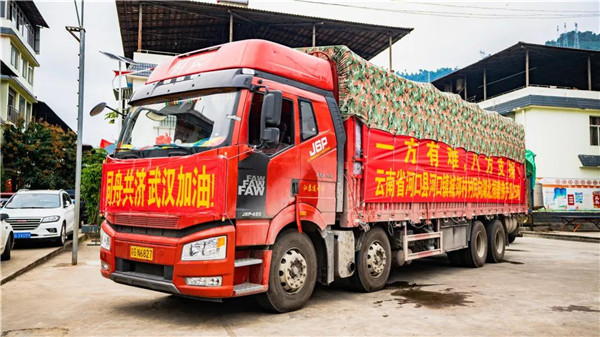 2月7日一辆满载爱心菜农“温暖情谊”的卡车缓缓驶离河口县城郊村