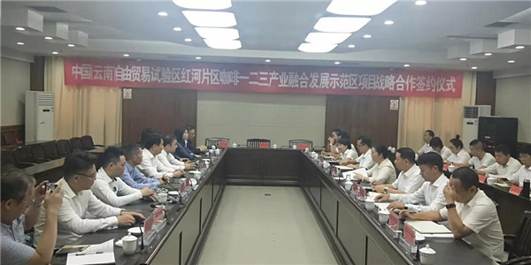 10月22日,中国(云南)自由贸易试验区红河片区管委会、河口县人民政府与广州猫屎咖啡连锁有限公司签署了《中国(云南)自由贸易试验区红河片区咖啡一二三产业融合发展示范区项目战略合作协议》。该项目也是中国(云南)自贸试验区红河片区(以下简称“红河片区”)正式挂牌后签约的第一个招商引资项目。