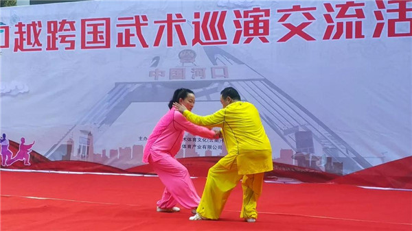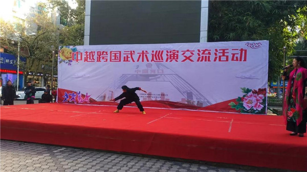 巡演在太极拳对练中拉开序幕,表演者在柔和的背景音乐中舒缓起手,舒展身体,于动静之中诠释太极魅力,随后太极功夫扇、太极拳、太极剑等节目精彩纷呈,接连上演,身着统一服饰的表演者们依次上场大秀拳技。他们或站如松、坐如钟,或野马分鬃、白鹤亮翅,腾、挪、转、移,将太极功夫含蓄内敛、以柔克刚、急缓相间的风格展现得淋漓尽致。而千变万化的子午鸳鸯钺成了巡演中的一大亮点,表演者刚柔相济的手法,闲适内敛的神情、舒缓轻曼的动作,充分表现出了它步行八方、虚实结合的特点。随后,河口本土文艺队与石林撒尼族“阿细跳月”的演员们为大家带来了精彩的抛绣球表演,接地气的表演,亲民的表现形式点燃了现场观众的热情,将巡演推向高潮,现场掌声阵阵。