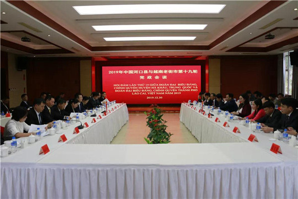 12月30日,以中共河口县委书记杜应昆为团长的河口县党政代表团与以老街省委常委、老街市委书记梅庭定为团长的越南老街市党政代表团在中国河口县举行第19轮党政会谈。