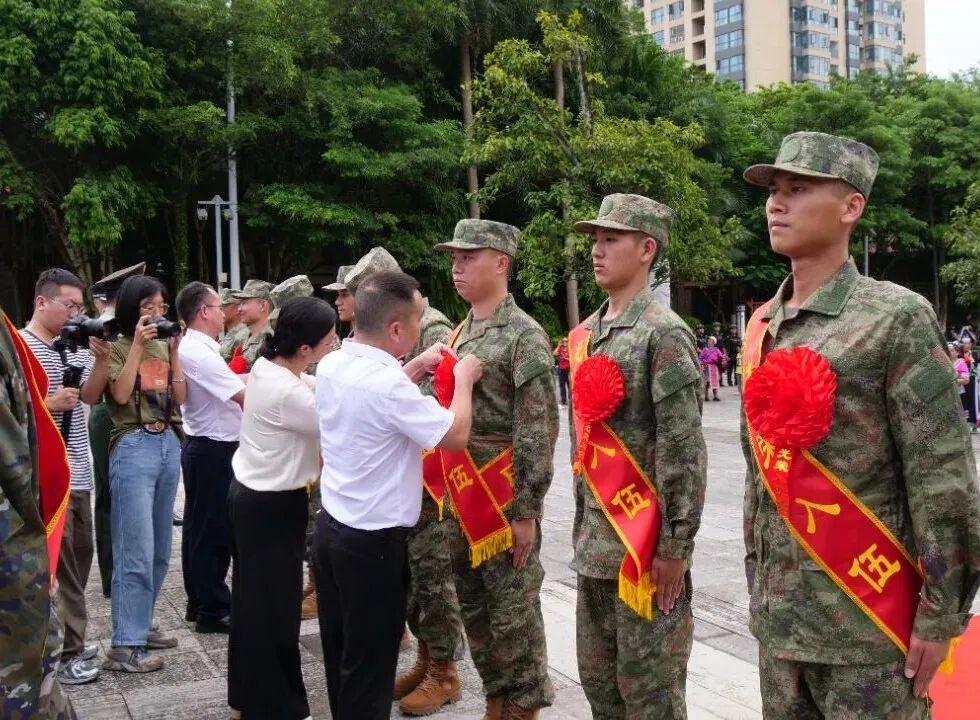 出席仪式的领导为入伍新兵们佩戴“光荣花”和绶带