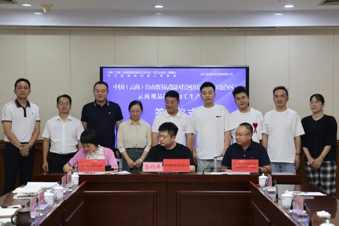 签约仪式上,自贸试验区红河片区(河口边合区)管委会副主任古明峰、县人民政府副县长李华梅、浙江观品科技发展有限公司总经理王海峰共同签订项目投资协议书。据悉,中国(云南)自由贸易试验区红河片区(河口边合区)云南观品服装加工生产项目计划总投资1亿元,预计可实现年产值约5亿元左右(包括该公司旗下或该公司引进的企业),年度综合纳税预计达1000万元以上,可解决6000人(含外籍工人)左右就业。项目整体投产后,预计年产梭织品类400万件,针织品类2000万件(包括羽绒服、夹克、冲锋衣等品类200万件)。项目的建设实施将进一步助推河口产业园轻纺服装特色产业发展,更加完善河口“区县”轻纺加工产业链。