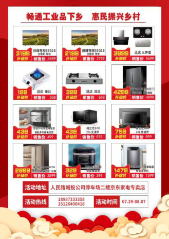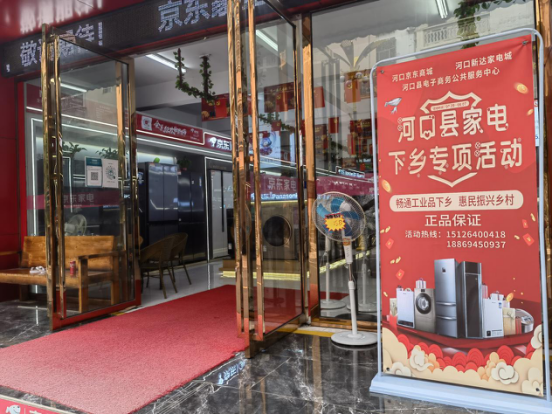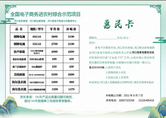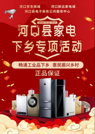 为全面推进河口县电子商务进农村综合示范项目工作进度,促进农产品上行和工业品下行线上线下相融合,形成工业品下行和服务消费双升级的农产品流通体系和现代农村市场体系,助力边民增收致富,河口县电子商务公共服务中心联合河口县京东商城(河口新达家电城)开展“河口县家电惠民”活动。