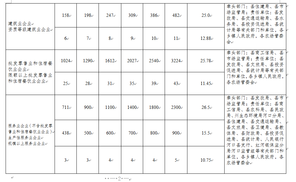 5. 培育壮大服务业企业(不含批发零售业和住宿餐饮业企业)。加快重点领域生产性服务业发展,着力打造一批货物运输、仓储物流、研发设计、检验检测、节能环保、数字经济等生产性服务业企业。大力推进物流枢纽建设,完善物流配送体系,加快打造物流产业集群。持续推进快递“两进一出”工程,加快推动邮政快递业基础设施建设。加大金融机构设立有关政策落实力度,大力引进内外资银行、证券期货、保险等金融机构,支持银行设立专营机构。依法依规稳妥发展融资租赁、融资担保、典当、保理等金融服务企业。紧紧抓住城市更新、老旧小区改造等重大工程,提升居民住宅物业管理服务,培育一批品牌物业服务业企业,推动形成一批城市更新、智慧社区运营、住房租赁等领域服务业企业。推进会展业转型升级,促进展会“双线”创新发展,培育一批服务水平高、专业优势突出、核心竞争力强的专业会展企业和特色会展企业。充分挖掘全县文化旅游资源潜力,推动民族文化等与创意设计、现代时尚、数字技术等融合发展,做精做优做特专业型骨干文旅企业和中小微文旅企业,培育一批新型文化企业、文创企业、智慧旅游创新企业。积极引进康养服务品牌落地,建设集体育训练比赛、健身康体、体育旅游等为一体的一流高原体育训练基地,培育新型体育和体育康养服务业企业。加快养老、托育、家政等家庭服务业发展,培育标准化、品牌化、连锁化、网络化的家庭服务业企业。到2025年,全县服务业企业达到2300家、年均增长26.5%,其中生产性服务业企业达到900家、年均增长15.5%;规模以上服务业企业达到5家、年均增长10.75%。(牵头部门:县发改局、县市场监管局;责任单位:县商工信局、县农科局、县民政局、州生态环境局河口分局、县住建局、县交通运输局、县文旅局、县卫健局、县教体局、县财政局、县投资促进局、县统计局、人民银行河口县支行、红河银保监分局河口监管组等有关部门和单位,各乡镇人民政府,各农场管委会)