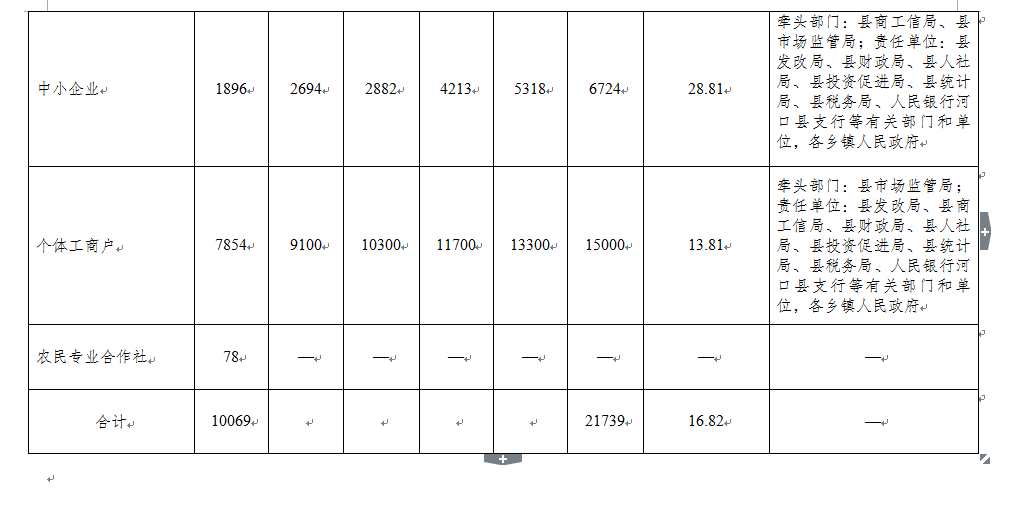 6. 培育中小企业和个体工商户。落实促进民营经济发展的各项政策措施,加快推进民营经济发展。推行县级“专精特新”中小企业培育政策体系,培育更多“小巨人”企业。设立县级中小企业发展专项资金,聚焦重点产业链上下游市场主体培育,支持中小企业创新能力提升、公共服务平台和融资体系建设。强化中小企业发展统筹协调机制作用,落实落地稳增长有关政策措施,优化中小企业发展支持政策,持续推动减税降费、减租降息、普惠金融等纾困惠企政策直达基层、直接惠及市场主体。进一步完善领导干部挂钩联系民营企业制度,加快构建亲清政商关系,大力弘扬企业家精神。建立扶持个体工商户发展部门联席会议制度,加快完善服务体系,加强创业指导引导,积极协调解决个体工商户租金、税费、社保、融资、用工等方面突出问题。落实“个转企”优惠政策,引导个体工商户转型升级为企业。到2025年,全县中小企业达到6724家、年均增长28.81%,个体工商户达到15000家,年均增长13.81%。(牵头部门:县商工信局、县市场监管局;责任单位:县发改局、县财政局、县人社局、县投资促进局、县统计局、县税务局、人民银行河口县支行等部门和单位,各乡镇人民政府,各农场管委会)
