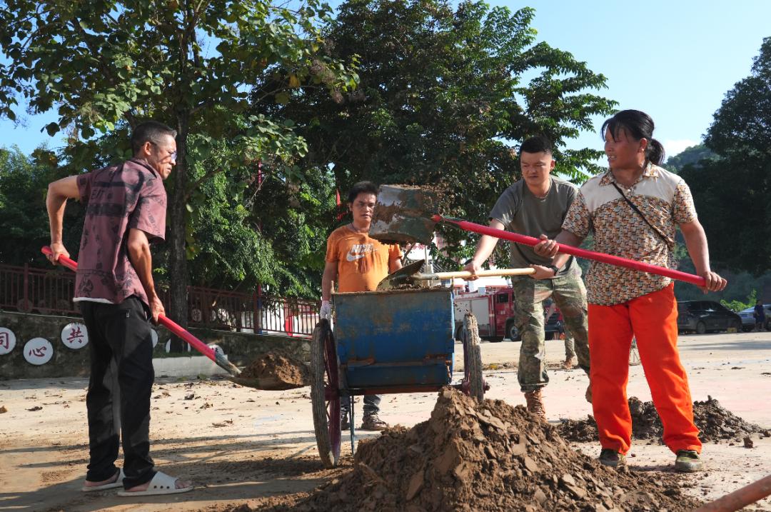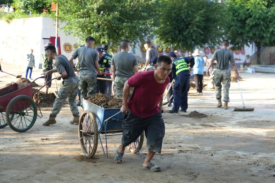 在五道河民族广场,党员干部带头,迅速投入到清淤行动中,大家手持工具,分工明确,干劲十足,有的负责清铲淤泥,有的负责搬运垃圾,有的负责冲洗地面,活动井然有序,氛围积极向上。