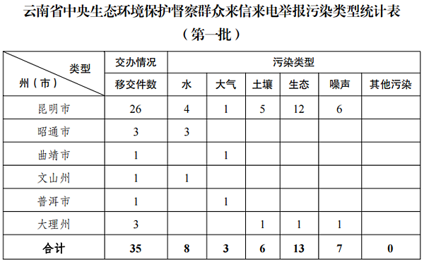 5月10日,中央第七生态环境保护督察组向云南移交第一批群众信访举报件35件,其中来电举报35件,来信举报0件。从信访举报件生态环境问题类型来看,涉及水8件、大气3件、噪声7件、土壤6件、生态13件(部分举报事件涉及多个问题类型)。从区域分布上看,昆明市26件、昭通市3件、曲靖市1件、文山州1件、普洱市1件、大理州3件。所有举报件均已及时转交相关州(市)处理。