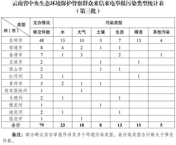 5月12日,中央第七生态环境保护督察组向云南移交第三批群众信访举报件79件,其中来电举报60件,来信举报19件。从信访举报件生态环境问题污染类型来看,涉及水23件、大气18件、土壤8件、生态13件、噪音15件,其他污染5件。从区域分布上看,昆明市48件、昭通市8件、曲靖市7件、玉溪市2件、保山市2件、红河州2件、普洱市3件、西双版纳州1件、大理州2件、德宏州1件、迪庆州2件、临沧市1件。截至当日,云南省已累计收到中央第七生态环境保护督察组交办的信访举报件169件,所有举报件均已及时转交相关州(市)处理。