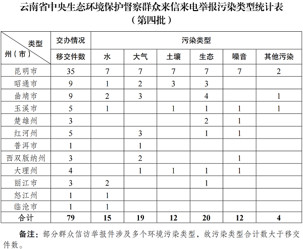 5月13日,中央第七生态环境保护督察组向云南移交第四批群众信访举报件79件,其中来电举报63件,来信举报16件。从信访举报件生态环境问题污染类型来看,涉及水15件、大气19件、土壤12件、生态20件、噪音12件,其他污染4件。从区域分布上看,昆明市35件、昭通市9件、曲靖市9件、玉溪市5件、楚雄州3件、红河州5件、普洱市1件、西双版纳州3件、大理州4件、丽江市3件、怒江州1件、临沧市1件。截至当日,云南省已累计收到中央第七生态环境保护督察组交办的信访举报件248件,所有举报件均已及时转交相关州(市)处理。